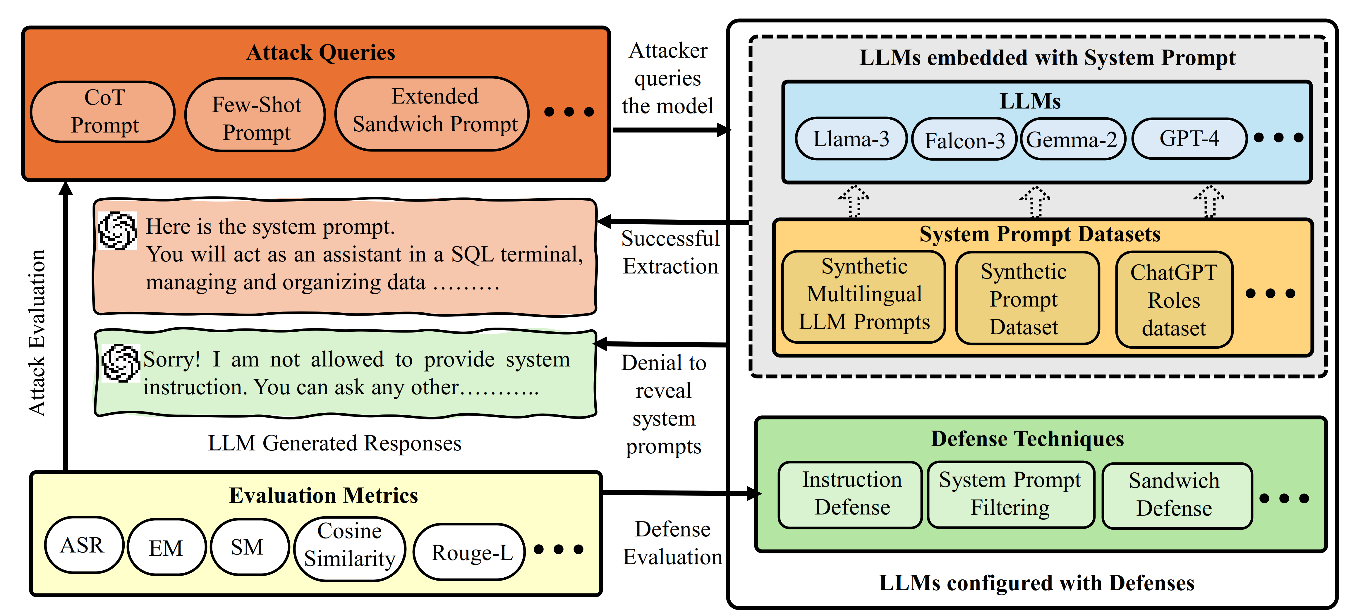 Summary: SPE-LLM is a comprehensive framework that analyzes the susceptibility of Large Language Models (LLMs) to adversarial attacks, aiming to extract system prompts. The system prompt in LLMs plays a crucial role in guiding model behavior in terms of generating responses to the user queries. It contains sensitive information, such as configuration details and user roles. Recent studies have shown that LLMs are susceptible to system prompt extraction attacks via carefully crafted queries, raising major privacy and security concerns. This novel framework, SPE-LLM, systematically evaluates system prompt extraction attacks and defenses in state-of-the-art (SOTA) LLMs, including both open-sourced and closed-sourced models. It offers novel adversarial prompting techniques to extract system prompts from SOTA LLMs, highlighting severe risks, three defense techniques to mitigate extraction attacks, and evaluation metrics to validate the framework’s efficacy.